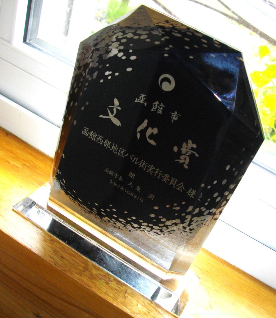 受賞理由に「歴史的街並みが残る函館西部地区の魅力を再発見・再評価し、食・文化・人の交流を通じて、地域の活性化と文化の振興を図ることを目的に」開催してきたとあり、旧市街地の活性化を願って続けてきた「函館西部地区バル街」を評価していただきました。コロナ禍の3年間の中止がありましたが、開始以来21年の持続に賞を与えていただいたことに感謝します。