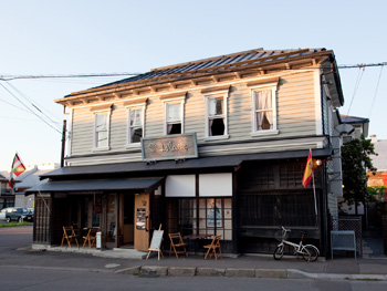 函館山からはマンションに挟まっているように見えます。大三坂を下ってぶつかる所にある築90年の建物です。バル街の今回のピンチョスは、函館男爵黒豚を使ったスペイン式肉団子を入れて3品用意しています。